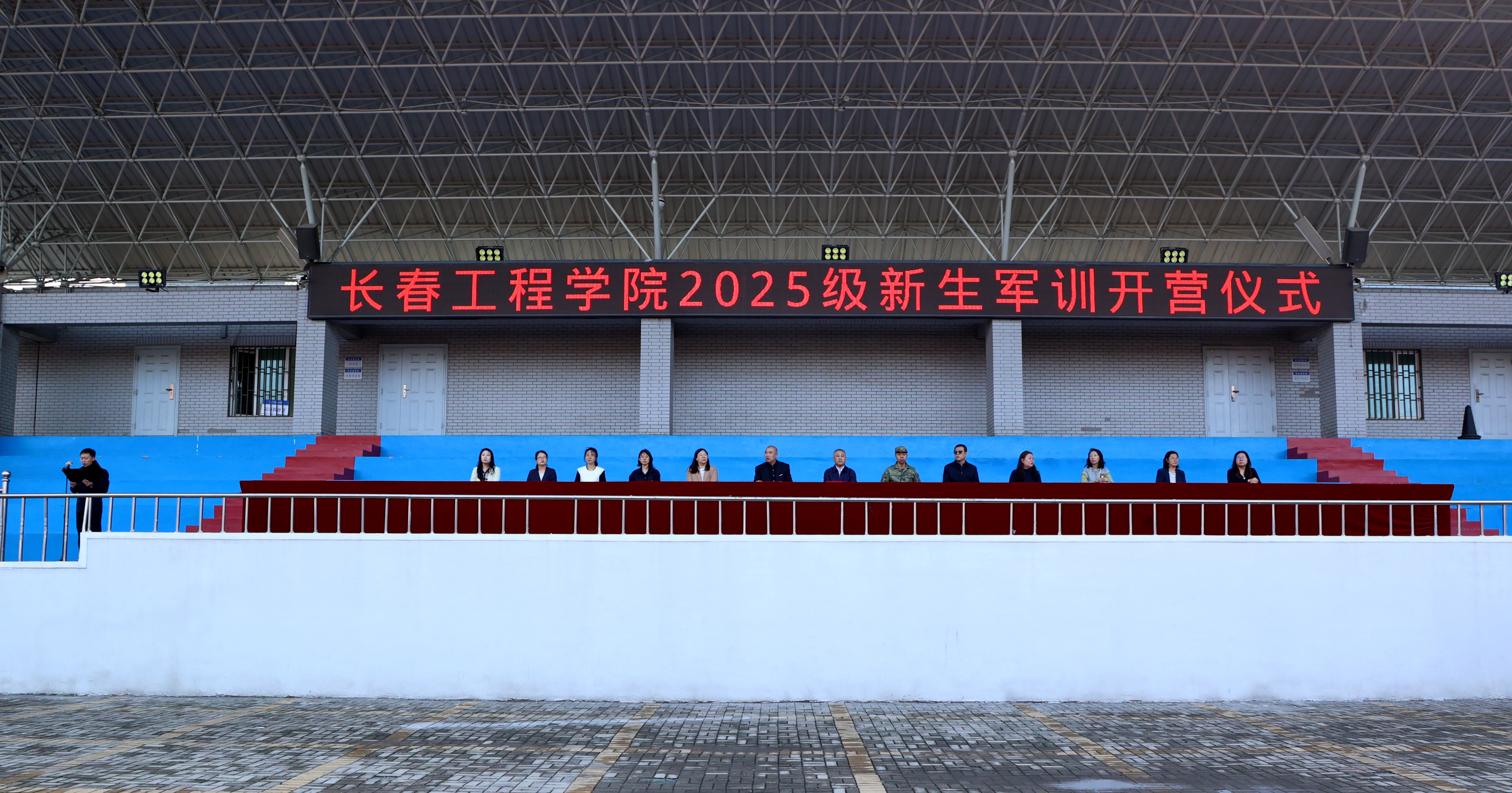 学校学生工作处、体育教研部相关负责人,各学院党委副书记和辅导员,全体承训教官及2025级全体参训学生参加军训开营仪式。
