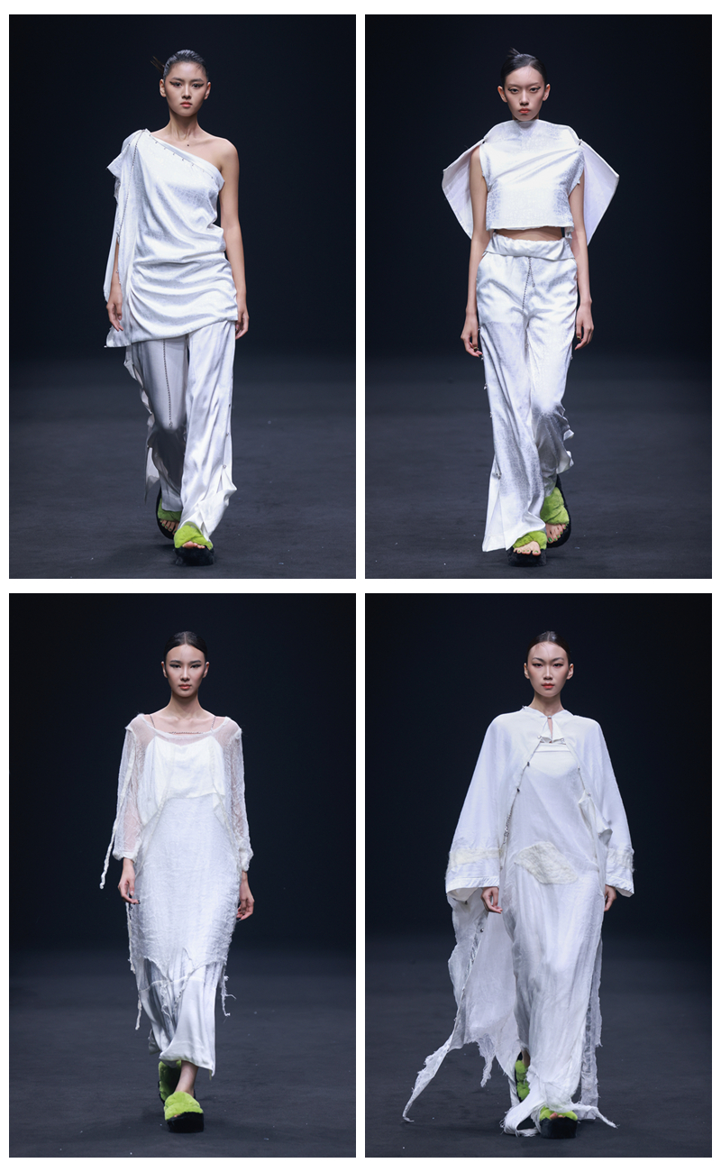 发布会上,陈佳老师以“荷着・无常”为主题推出系列女装。该系列依托校企合作服装品牌“荷着”的研发,通过企业与学校的联动合作,既为服装产业解决了非遗技法传承创新与市场转化的技术问题,也为学校师生提供了实战实践平台,实现教学成果与产业需求的共振与共赢。